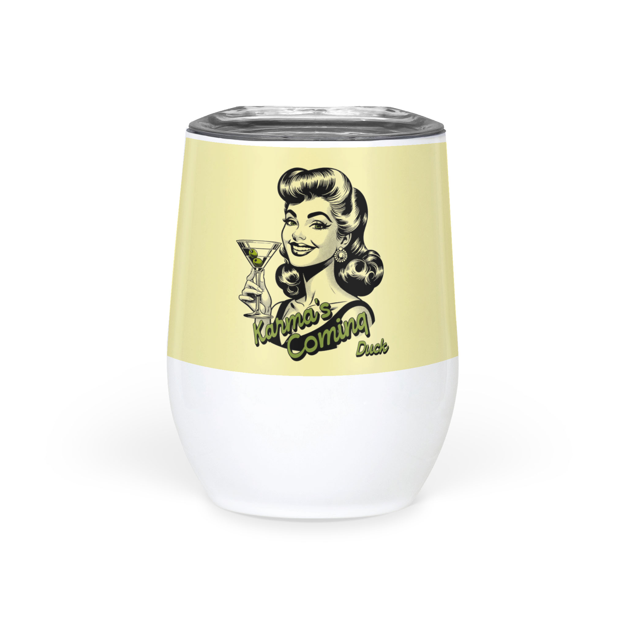 The Karma’s Coming, Duck Wine Tumbler pairs perfectly with quiet nights, loud thoughts, and the kind of justice best served cold. Featuring our iconic vintage lady—smiling like she knows something you don’t—and the cheeky tagline Karma’s Coming, Duck, this isn’t just drinkware. It’s a statement piece in stainless steel.