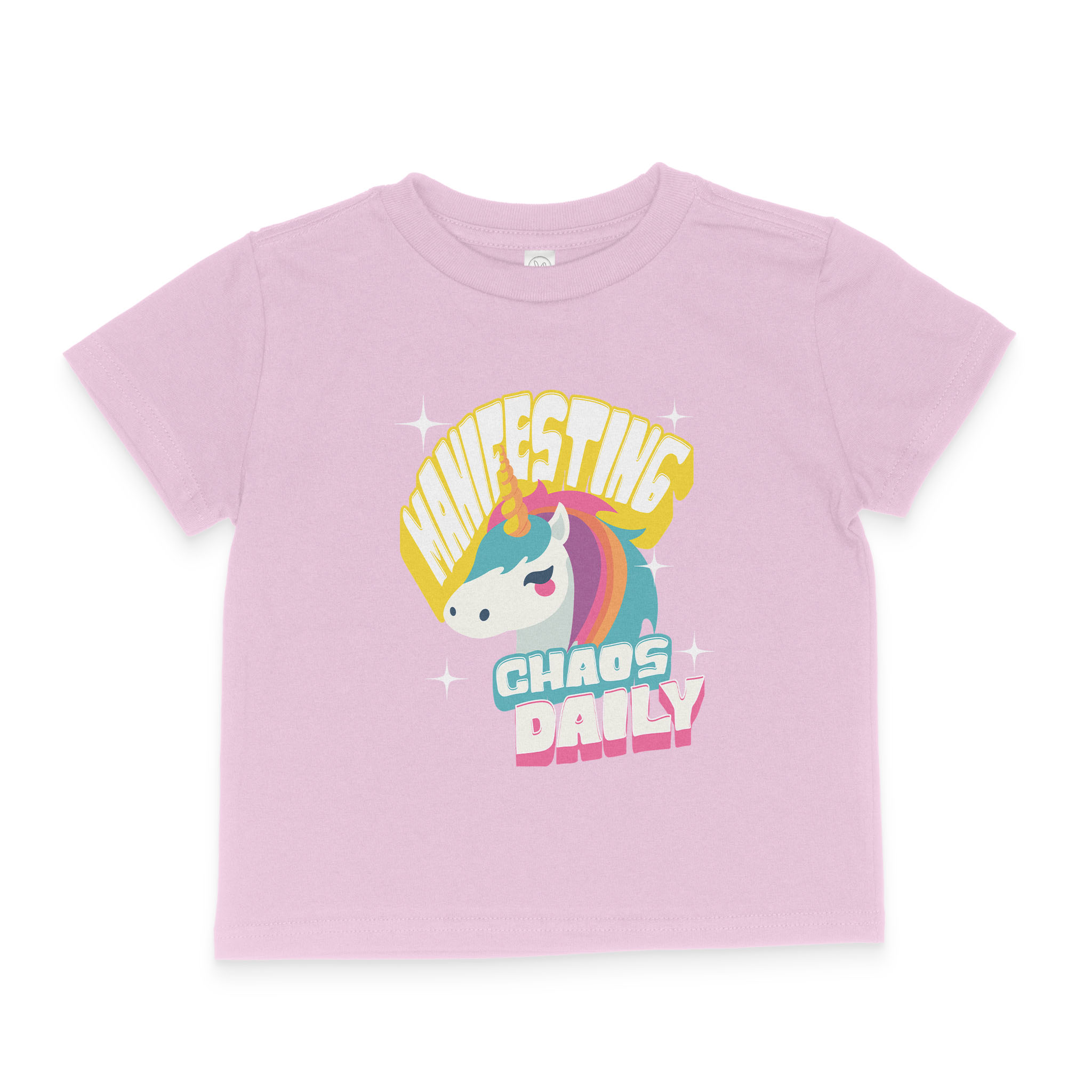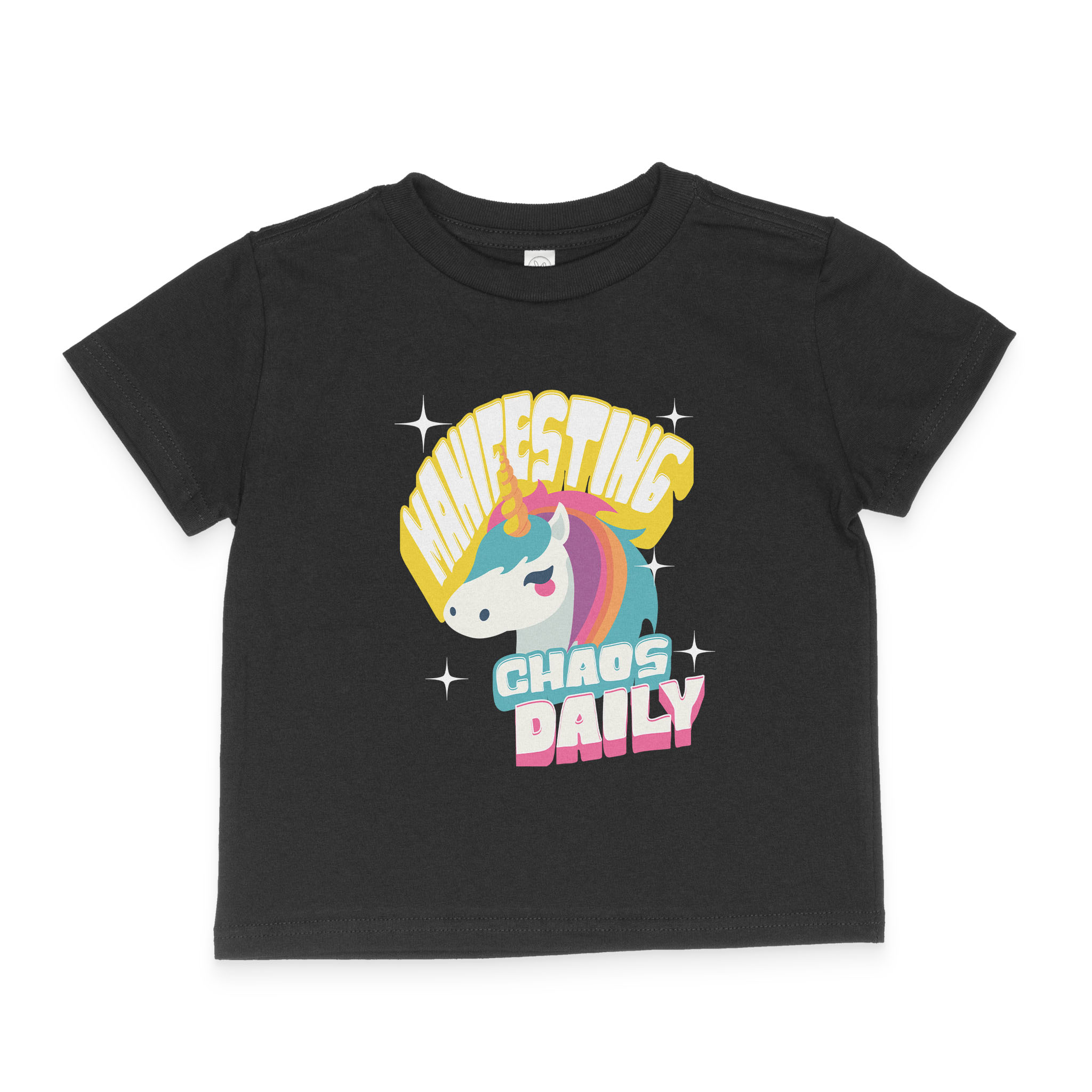 The Manifesting Chaos Daily Toddler Tee is soft enough for snuggles but bold enough for tantrums. Featuring our iconic cartoon unicorn and the tagline Manifesting Chaos Daily, this shirt is for the mini disruptor who doesn’t follow rules—they rewrite them in crayon.