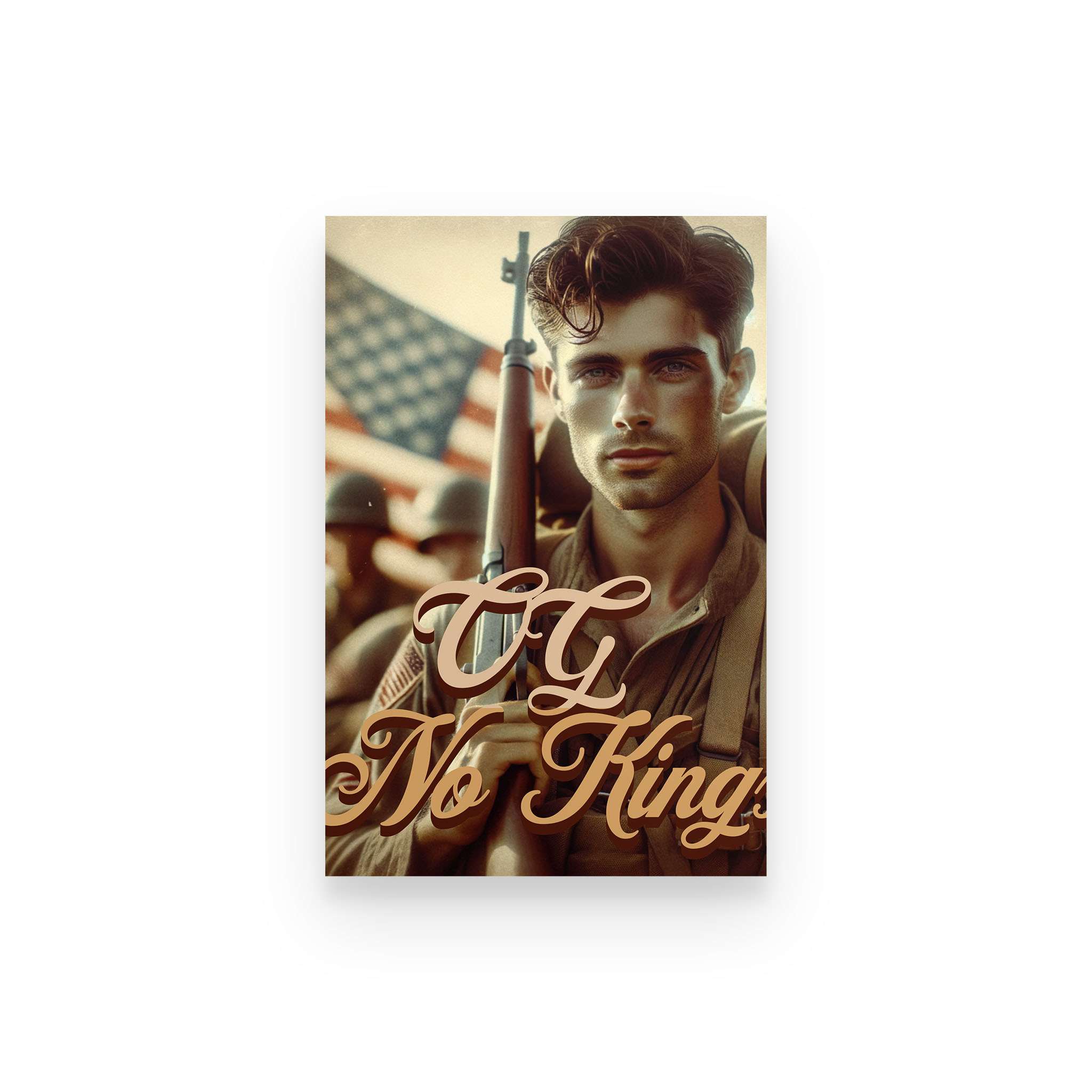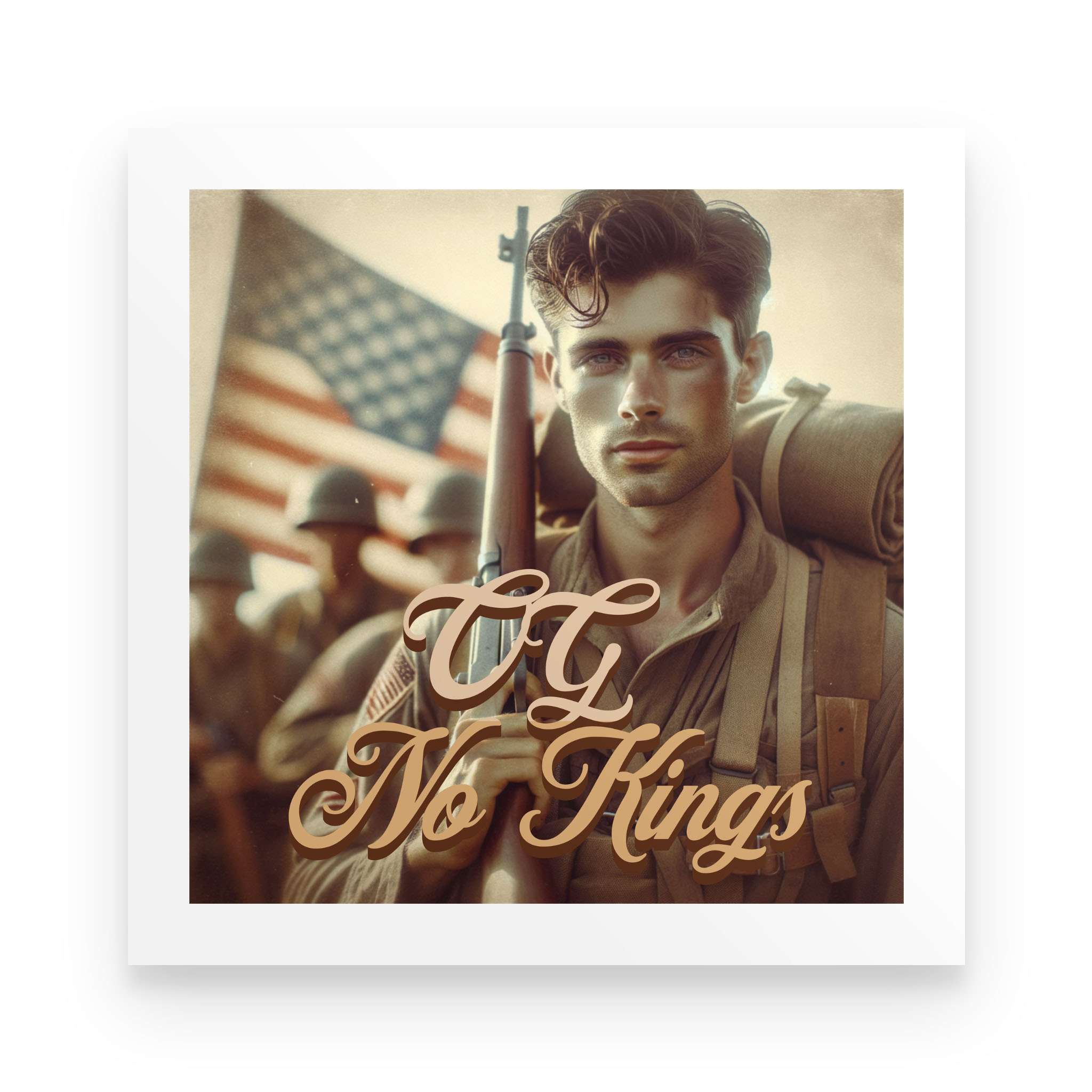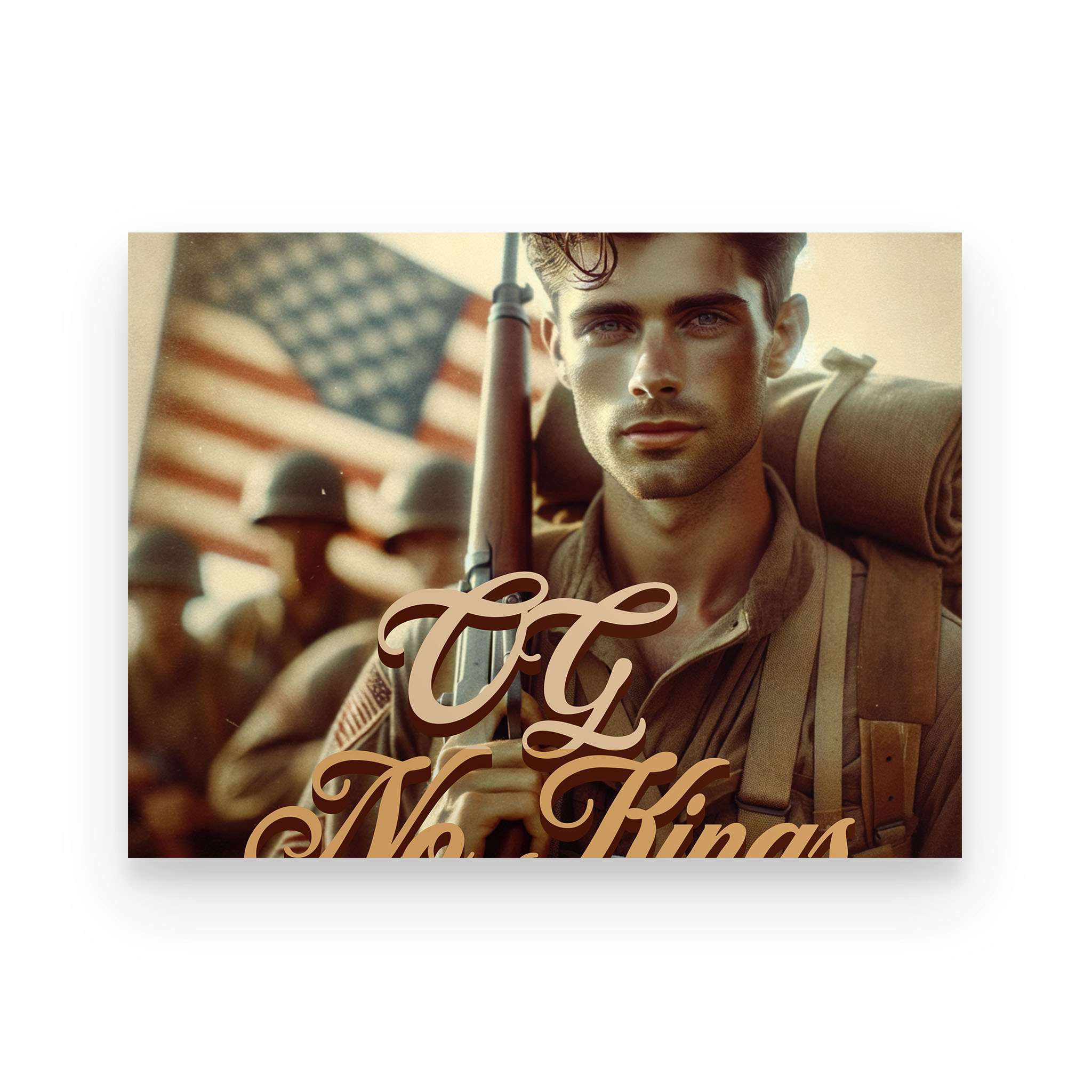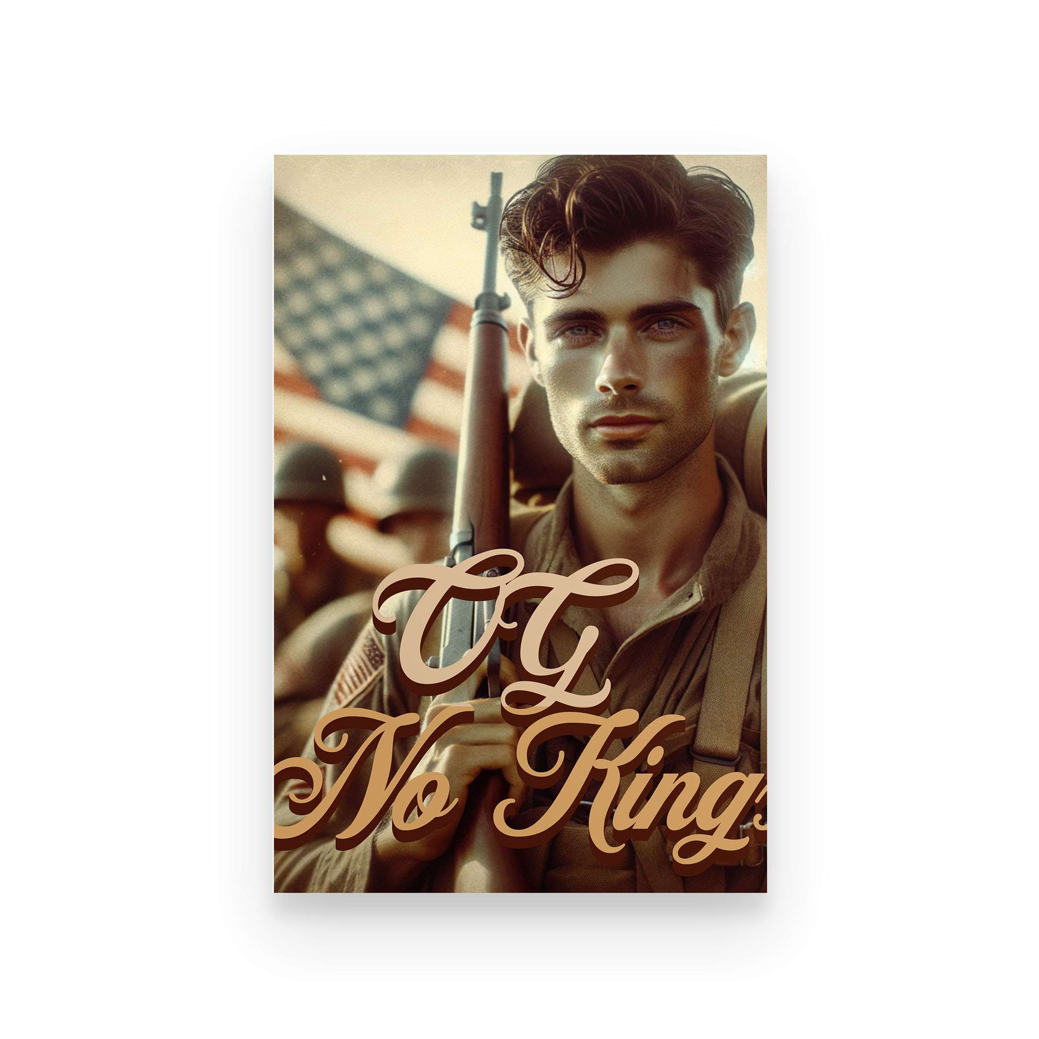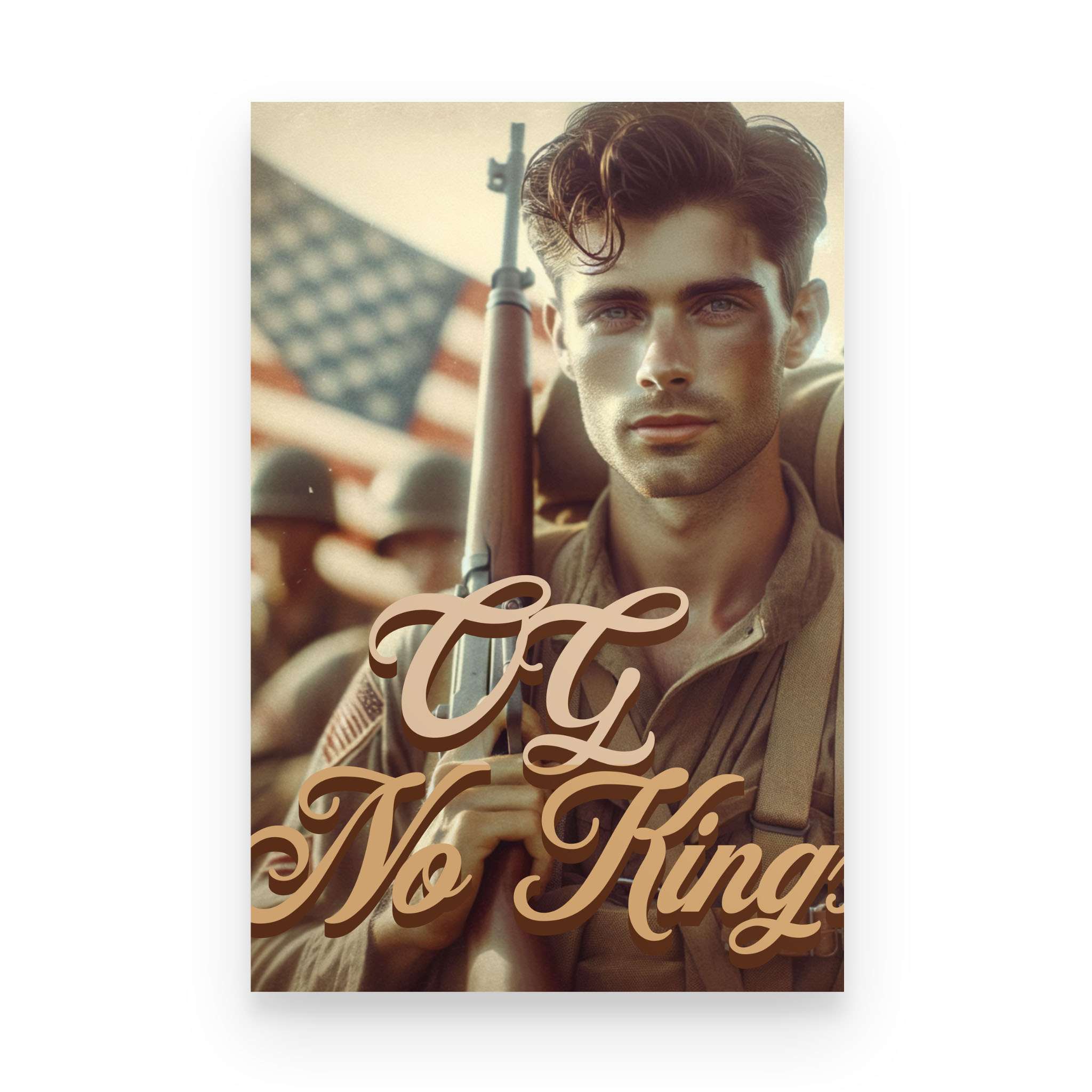 The OG No Kings Poster is a bold, full-color tribute to the ones who bled for a country without crowns—and the generations still refusing to bow. Featuring the revolutionary soldier clutching the Constitution or the WWII vet marching home from fire and ash, this piece is more than décor. It’s a proclamation.