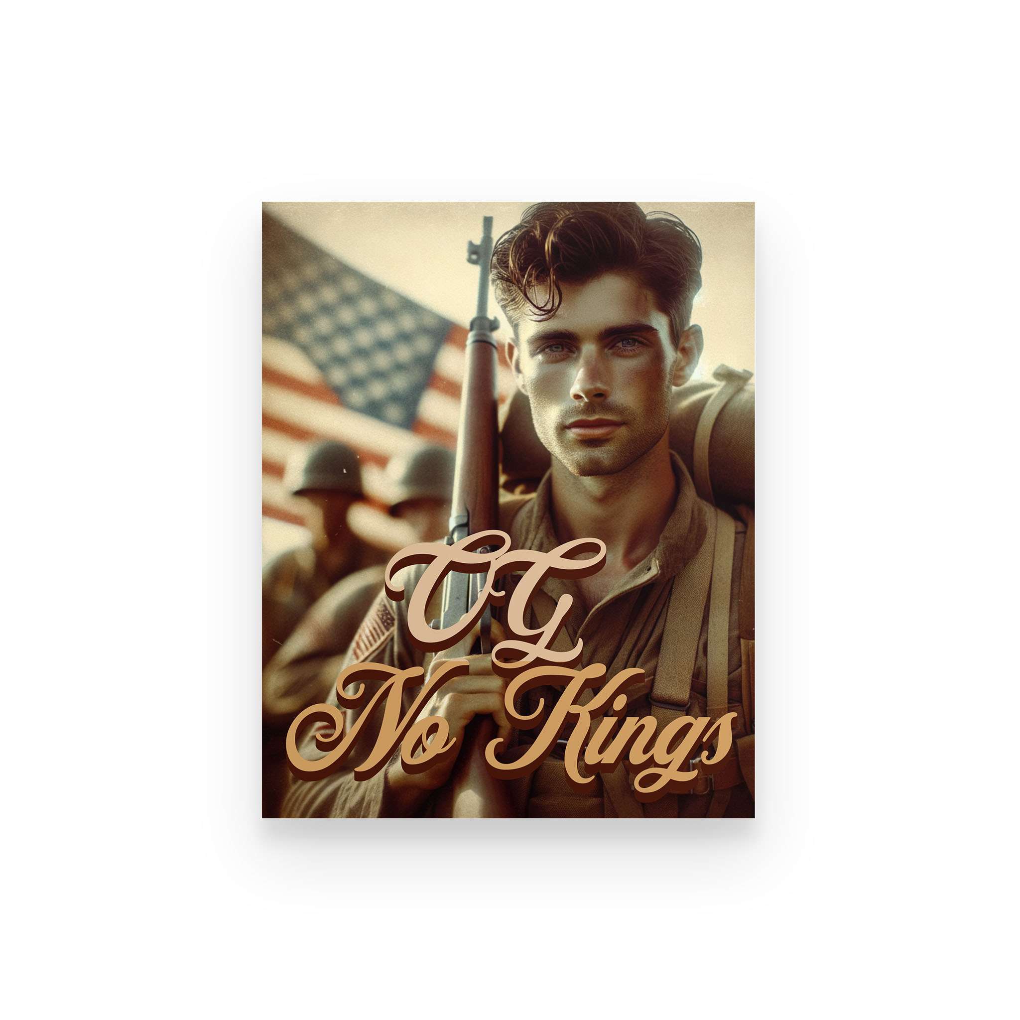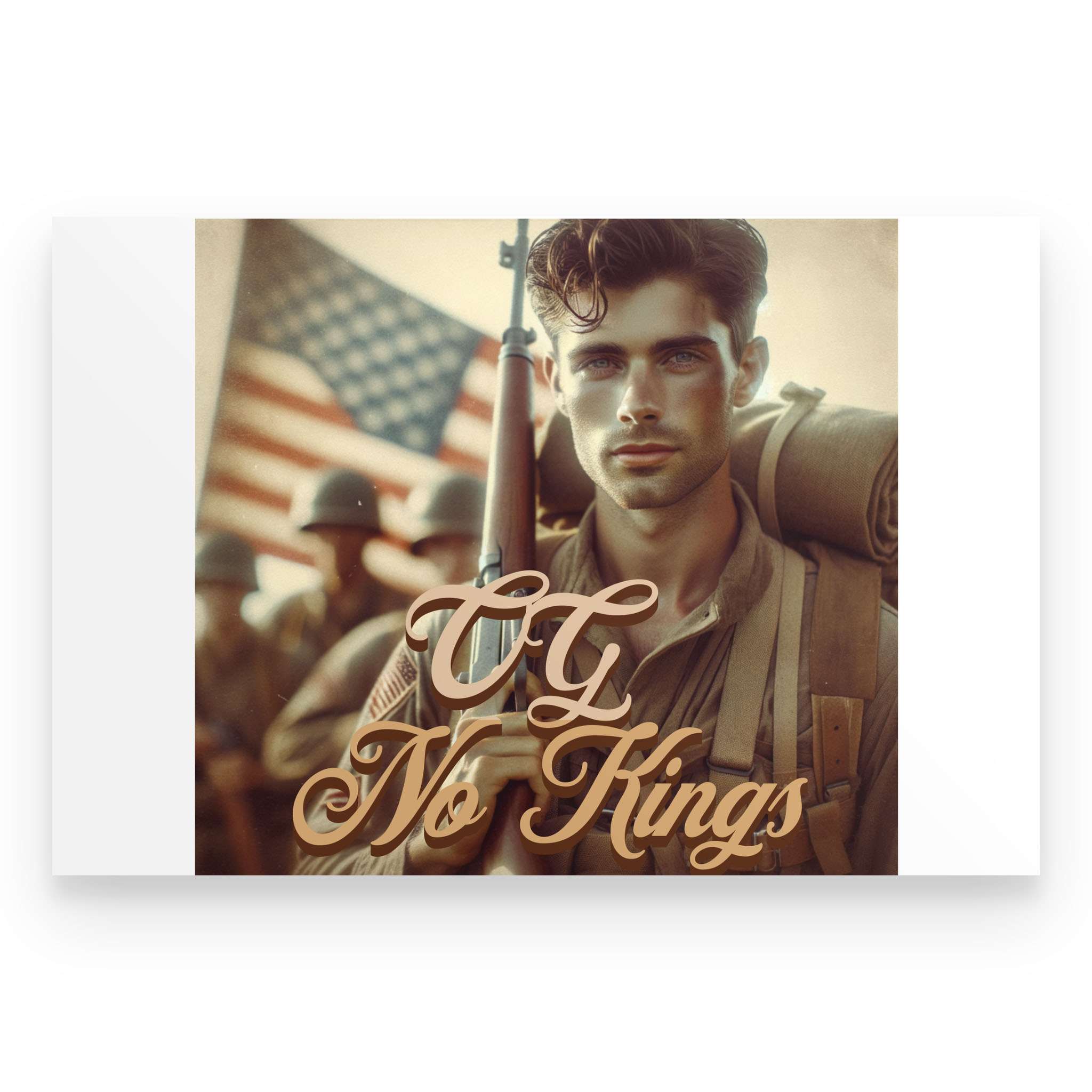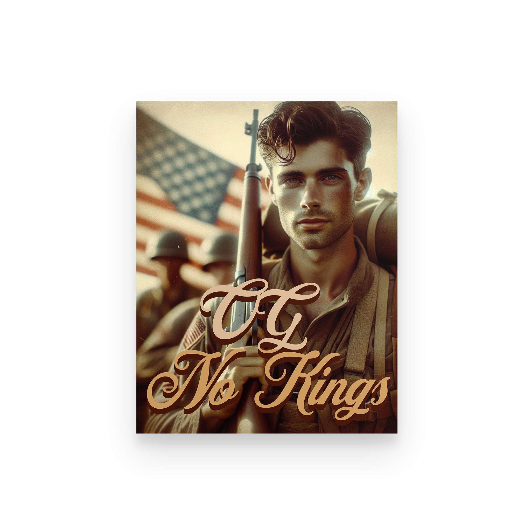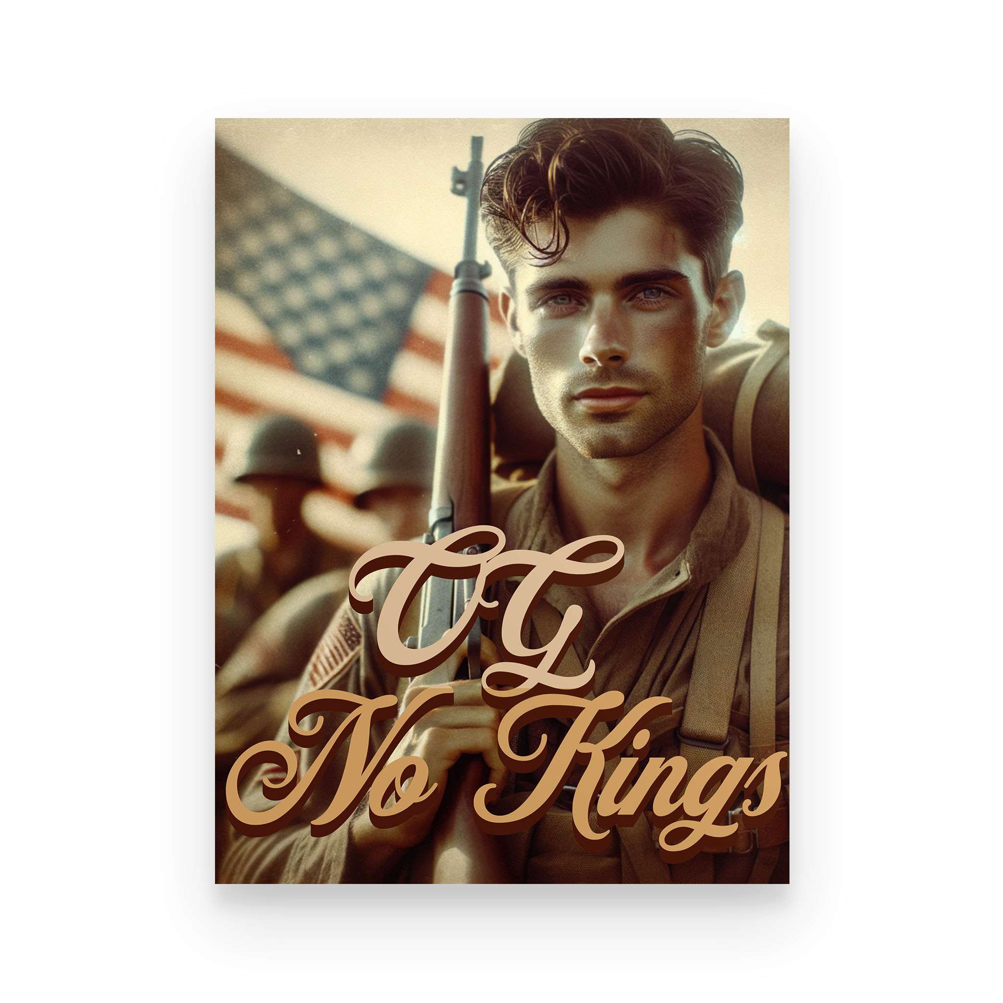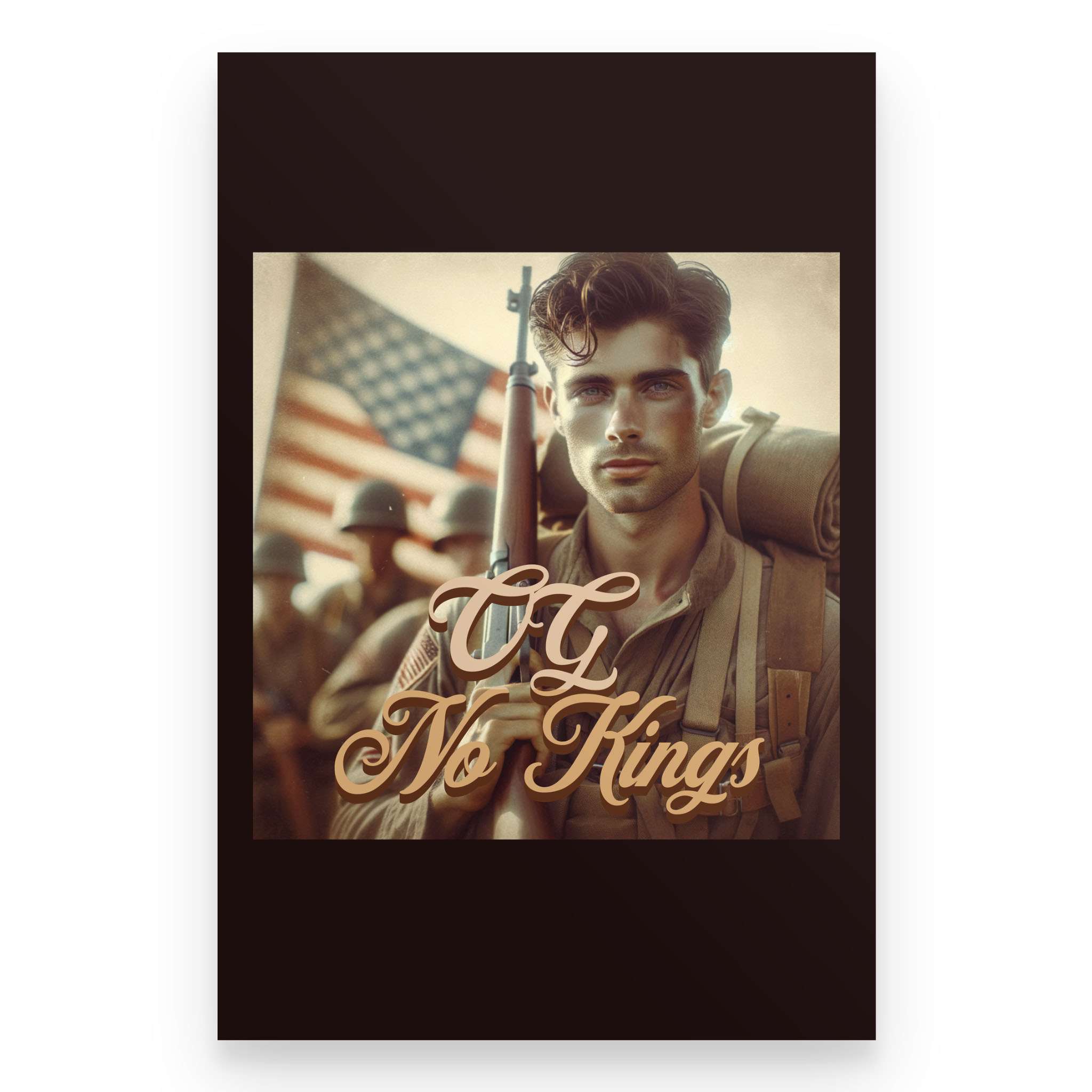 The OG No Kings Poster is a bold, full-color tribute to the ones who bled for a country without crowns—and the generations still refusing to bow. Featuring the revolutionary soldier clutching the Constitution or the WWII vet marching home from fire and ash, this piece is more than décor. It’s a proclamation.