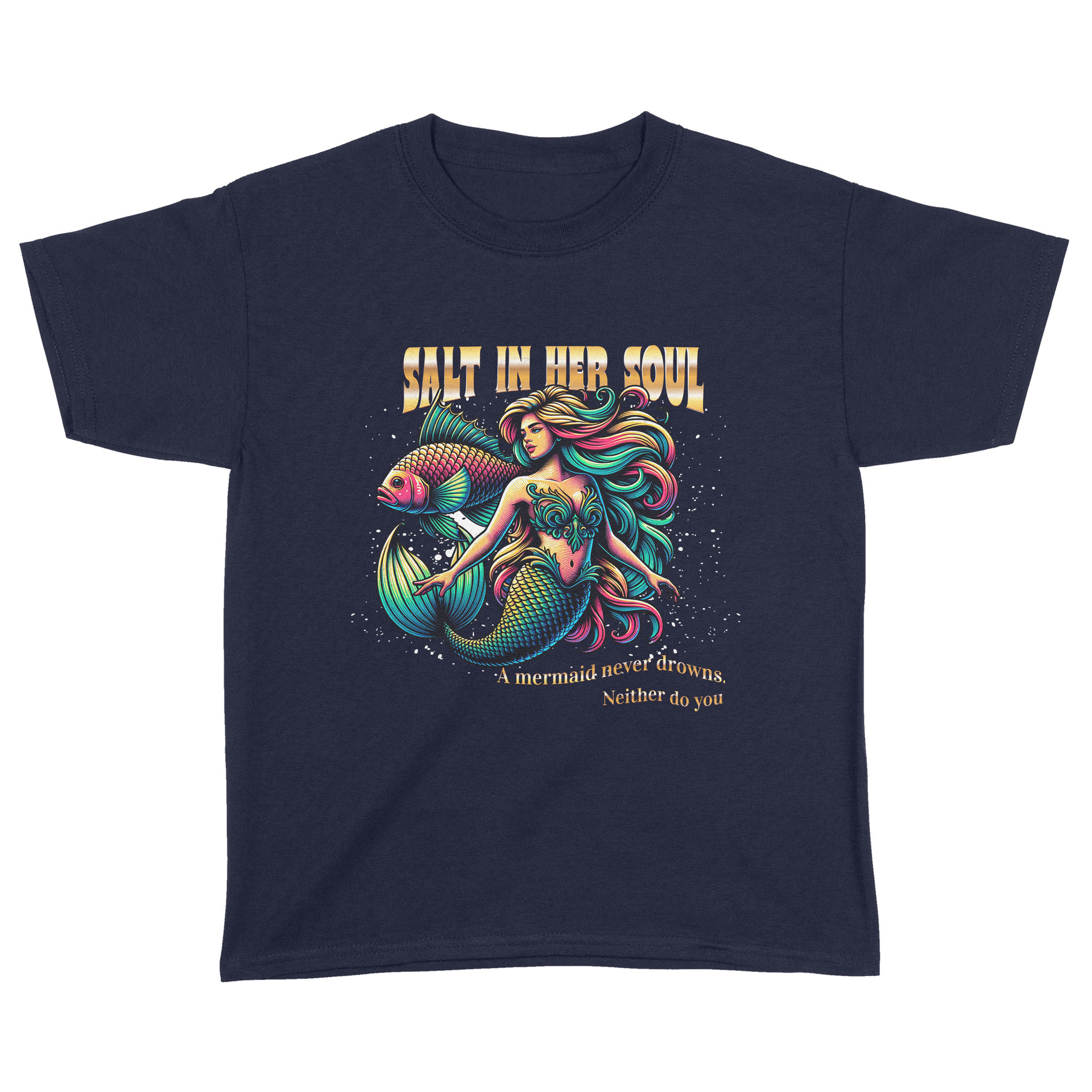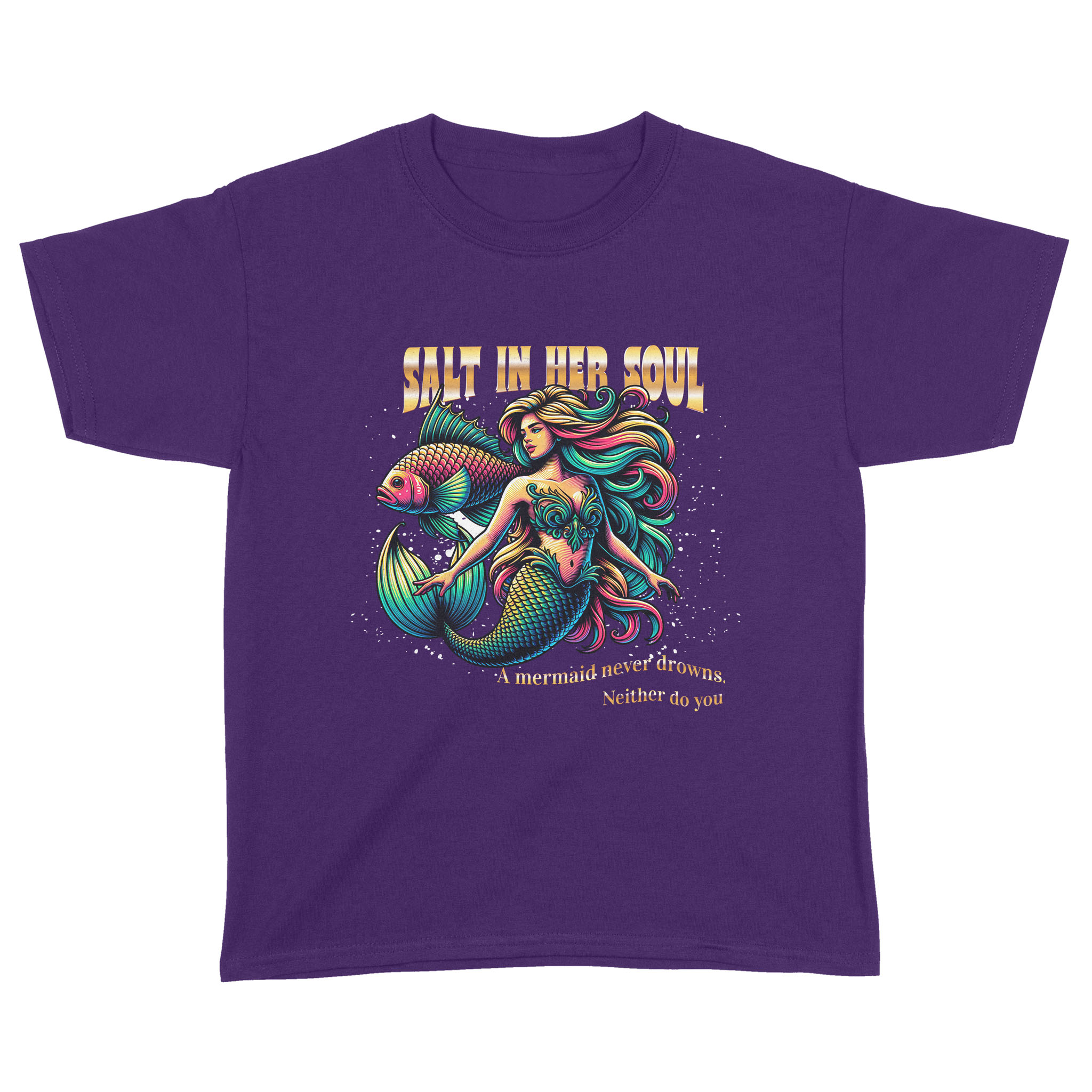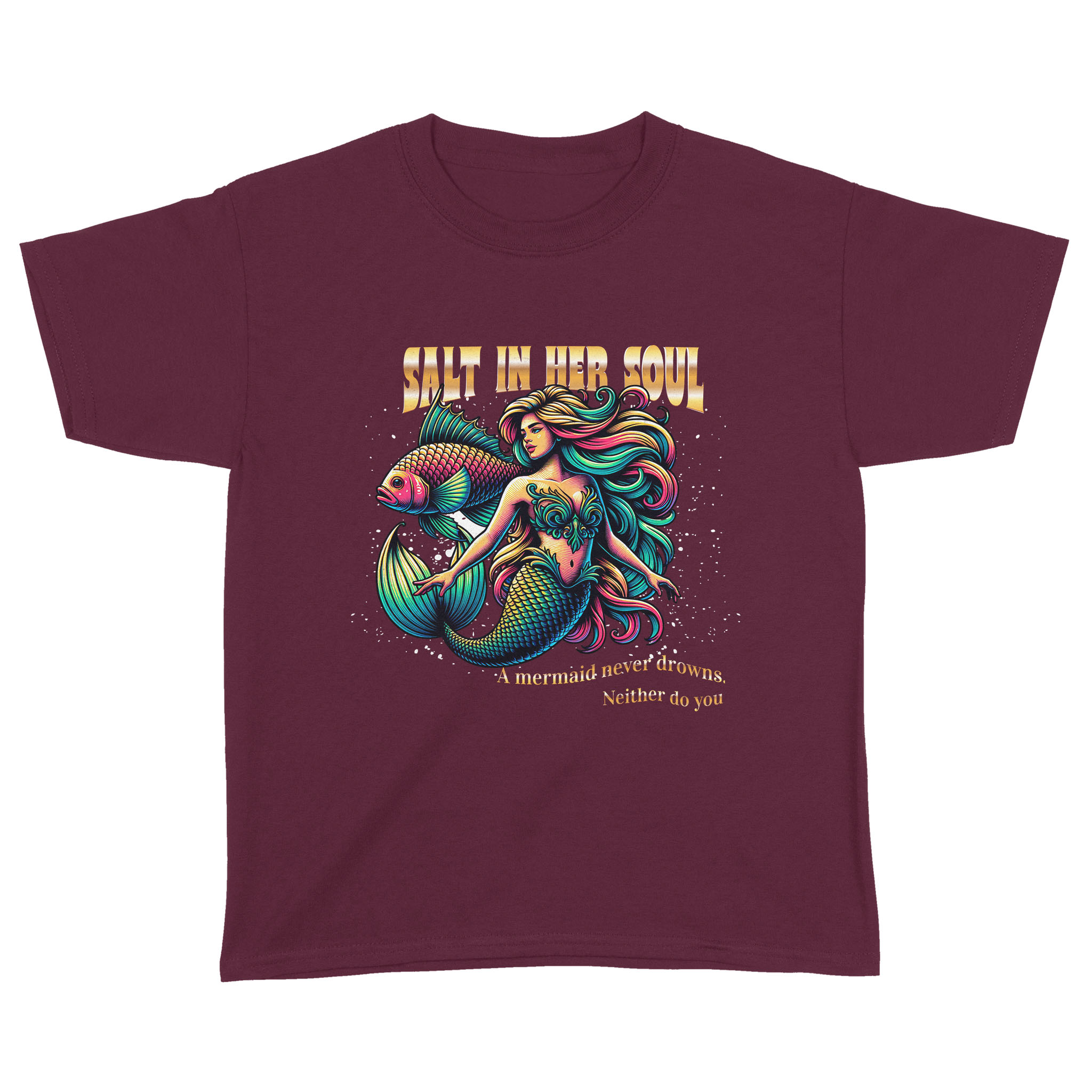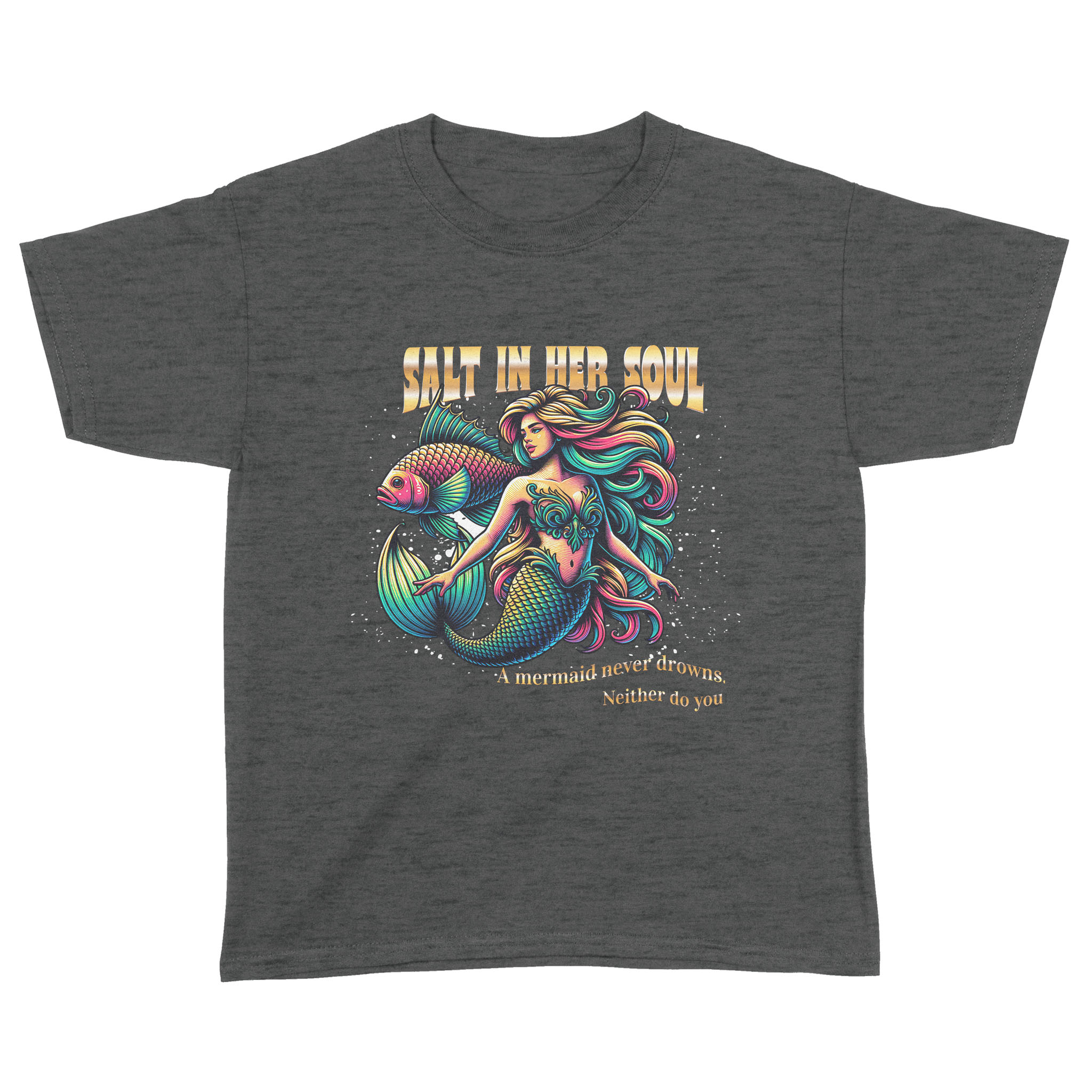 The Salty Mermaid Youth Tee is for every young legend who knows that strength isn’t about staying dry—it’s about learning to swim through the storm with sparkle. Featuring a bold design and the empowering tagline A mermaid never drowns. Neither do you, this tee is for the girls who rise with the tide and shine anyway.